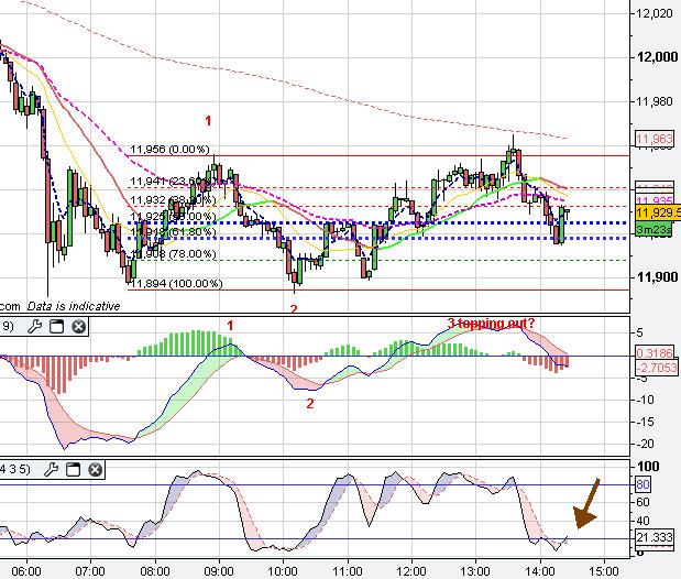 The DOW hrly has traced out a 3 wave equal measure strructure (so far).. current levels are pretty important and I'd suggest that much lower even if followed by a bounce (say another 100 points lower) suggests that further downside is certain and that means around 11600 ish...